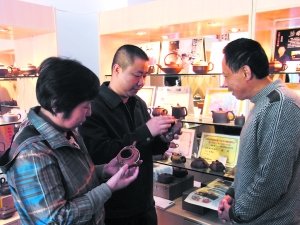 市民李明俊手上提着一个包装好的紫砂壶,他在店内欣赏了一个小时,才转身欲去。