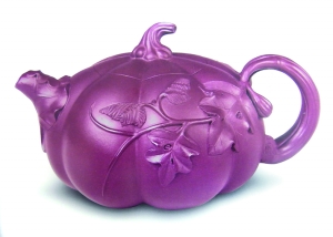 紫砂《南瓜壶》质朴自然,南瓜叶翻卷成壶嘴,瓜蒂为壶盖,瓜藤扭曲成壶把,在寂静中感觉生命在律动,壶上叶蔓飘逸,好一派农家田园的情趣。
